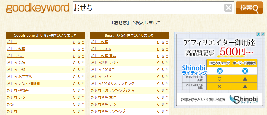 たとえば「おせち料理の通販ランキング」のことについて書きたいならメインのキーワードは「おせち」ということになります。